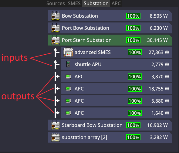 Clicking on any entry in the section will show you a detailed list of every connection they have, what they receive power from and what they distribute it to. In this case, the Port Stern Substation is being powered by the advanced SMES and itself, powers 4 APCs.