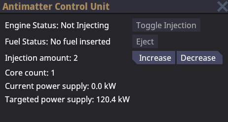 The only important thing to note in this UI is that the Injection amount needs to always be twice the amount of core count for nominal power production. Once you've set it up, toggle the injection and you're done. One thing to note is that the AME will consume it's fuel at a very rapid rate, meaning that once it's active, setting up the main engine will be your primary goal. Upon completion, turning off the AME to preserve it's fuel in case of emergency. Running out of AME fuel before setting the engine up will make your job much harder since both the Tesla and Singularity require power to maintain the barrier. Absence of a barrier will cause the Tesla or Singularity to become loose, which will induce devastating structural damage and potentially irrecoverable deaths.