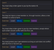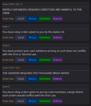 | 10:16, 13 May 2025 | Emagged Borg Lawset.PNG (file) | 67 KB | Example of an emagged borg's laws. | 1 | |